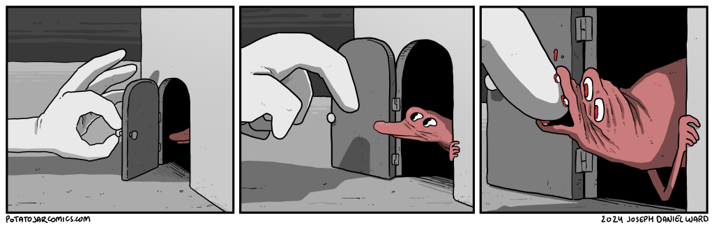 CHOMP’D by Joseph Daniel Ward on January 19, 2024 at 5:52 pm Why do you chomp? Put this thing elsewhere: Click to share on X (Opens in new window) X Click to share on Facebook (Opens in new window) Facebook Click to share on Reddit (Opens in new window) Reddit Click to share on Tumblr (Opens in new window) Tumblr └ Tags: chomp, door Comment