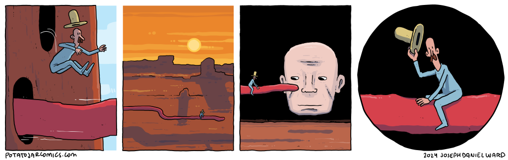 HOWDY by Joseph Daniel Ward on March 13, 2024 at 5:48 pm Apparently this is the fifth time I’ve named a comic “Howdy,” but how could I name it anything else? Put this thing elsewhere: Click to share on X (Opens in new window) X Click to share on Facebook (Opens in new window) Facebook Click to share on Reddit (Opens in new window) Reddit Click to share on Tumblr (Opens in new window) Tumblr └ Tags: cowboy, head, hole, howdy, worm Comment