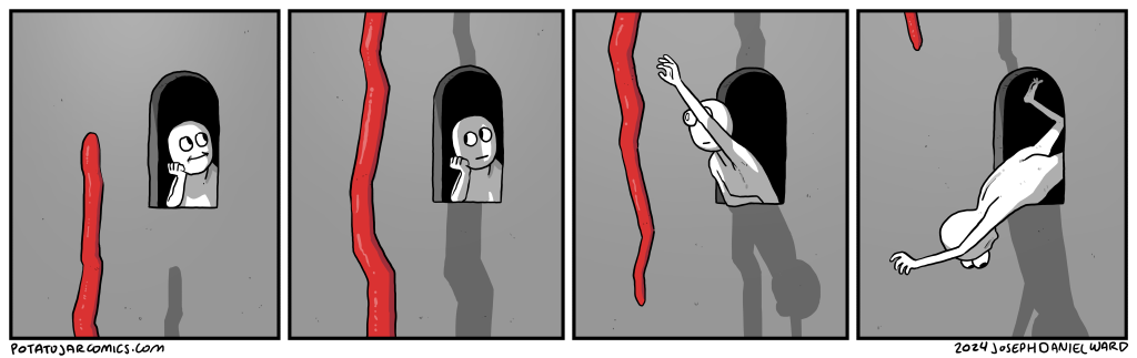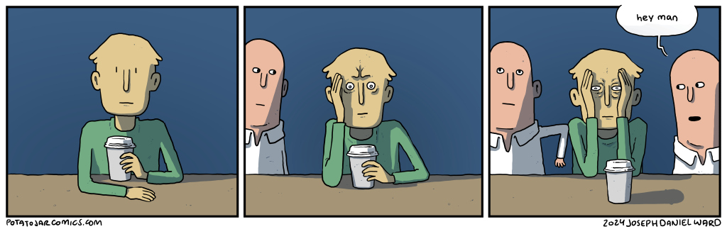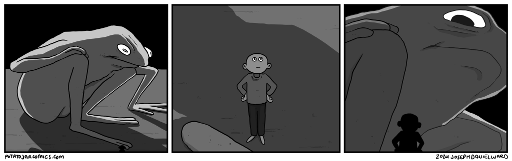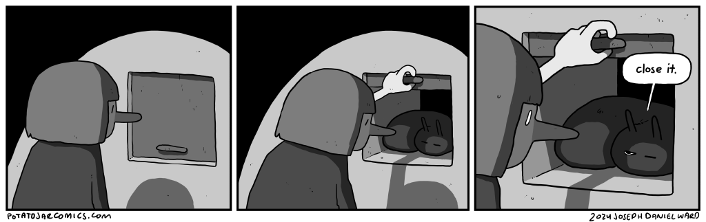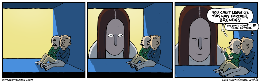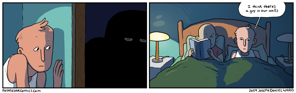 Yeah: Definitely a guy in those walls. EDIT: Sorry for the delay, friends, but Friday’s comic will go up on Saturday instead (7/20)! I have a comic in progress, but I woke up with a big ol’ headache again —[…]↓ Read the rest of this entry…