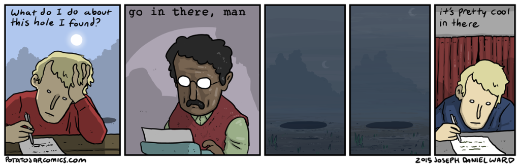 A HOLE by Joseph Daniel Ward on May 19, 2015 at 3:42 am You can’t know what’s in a hole without going in a hole. Put this thing elsewhere: Click to share on X (Opens in new window) X Click to share on Facebook (Opens in new window) Facebook Click to share on Reddit (Opens in new window) Reddit Click to share on Tumblr (Opens in new window) Tumblr └ Tags: a hole, advice, correspondence, go in there Comment