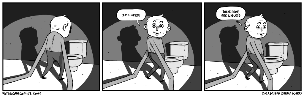 TOILET TROUBLE by Joseph Daniel Ward on March 17, 2021 at 2:33 pm I don’t know about USELESS, but yer gonna have to get creative. Put this thing elsewhere: Click to share on X (Opens in new window) X Click to share on Facebook (Opens in new window) Facebook Click to share on Reddit (Opens in new window) Reddit Click to share on Tumblr (Opens in new window) Tumblr └ Tags: arms, oh no, toilet Comment