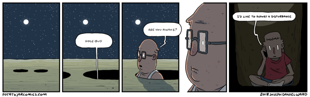 HOLE-BUD’S NEW NEIGHBOR by Joseph Daniel Ward on August 15, 2018 at 4:11 am Characters: Friend, Hole-Bud Why did you let him dig that hole? Put this thing elsewhere: Click to share on X (Opens in new window) X Click to share on Facebook (Opens in new window) Facebook Click to share on Reddit (Opens in new window) Reddit Click to share on Tumblr (Opens in new window) Tumblr └ Tags: awake, hole, phone, police, two holes Comment