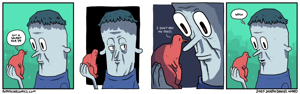CONFIDANT by Joseph Daniel Ward on November 11, 2020 at 4:05 am You probably should pay those, you know. Put this thing elsewhere: Click to share on X (Opens in new window) X Click to share on Facebook (Opens in new window) Facebook Click to share on Reddit (Opens in new window) Reddit Click to share on Tumblr (Opens in new window) Tumblr └ Tags: bird, taxes Comment