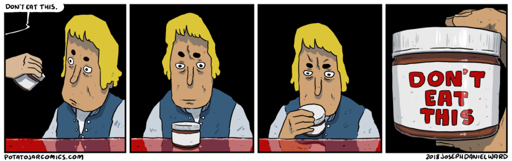 DON’T EAT THIS by Joseph Daniel Ward on February 7, 2018 at 6:16 am He’s right, you know. Put this thing elsewhere: Click to share on X (Opens in new window) X Click to share on Facebook (Opens in new window) Facebook Click to share on Reddit (Opens in new window) Reddit Click to share on Tumblr (Opens in new window) Tumblr └ Tags: don't, eat, this Comment