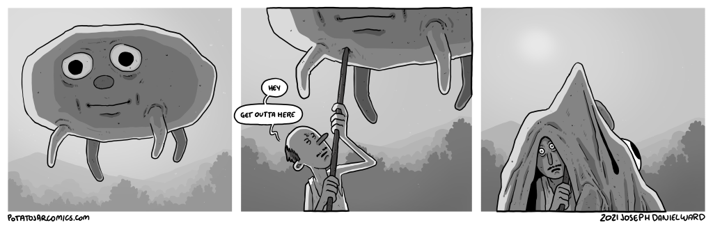 THE VISITOR by Joseph Daniel Ward on March 12, 2021 at 3:49 am You just poke strangers with a big stick, huh? Put this thing elsewhere: Click to share on X (Opens in new window) X Click to share on Facebook (Opens in new window) Facebook Click to share on Reddit (Opens in new window) Reddit Click to share on Tumblr (Opens in new window) Tumblr └ Tags: get outta here, hi, stick, visitor Comment