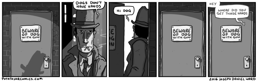 AND THEN HE DIES by Joseph Daniel Ward on January 19, 2016 at 5:54 am Give a dog a gun, it can’t hand. Give a dog a hand, it can gun. Put this thing elsewhere: Click to share on X (Opens in new window) X Click to share on Facebook (Opens in new window) Facebook Click to share on Reddit (Opens in new window) Reddit Click to share on Tumblr (Opens in new window) Tumblr └ Tags: dog, gun, hands, hey Comment