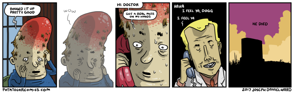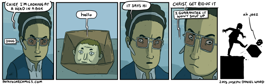 A HEAD IN A BOX by Joseph Daniel Ward on September 10, 2015 at 2:35 am Chapter: COMICS The chief has had plenty of experience with this. Put this thing elsewhere: Click to share on X (Opens in new window) X Click to share on Facebook (Opens in new window) Facebook Click to share on Reddit (Opens in new window) Reddit Click to share on Tumblr (Opens in new window) Tumblr └ Tags: bluetooth?, box, head, kicked off a cliff, law enforcement?, shut up Comment