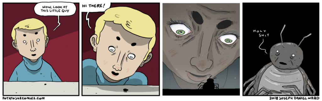 HI THERE! by Joseph Daniel Ward on August 22, 2018 at 6:14 am Bad news, little guy: Everything else is big. Put this thing elsewhere: Click to share on X (Opens in new window) X Click to share on Facebook (Opens in new window) Facebook Click to share on Reddit (Opens in new window) Reddit Click to share on Tumblr (Opens in new window) Tumblr └ Tags: hello, insect maybe, little guy, oh no, spider maybe Comment
