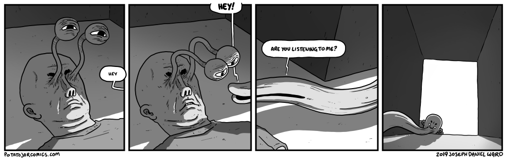ARE YOU LISTENING TO ME? by Joseph Daniel Ward on October 23, 2019 at 3:43 pm I have prehensile eyes, not prehensile ears. Put this thing elsewhere: Click to share on X (Opens in new window) X Click to share on Facebook (Opens in new window) Facebook Click to share on Reddit (Opens in new window) Reddit Click to share on Tumblr (Opens in new window) Tumblr └ Tags: eyes, hello, mouth Comment