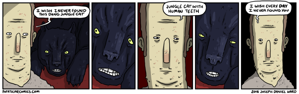JUNGLE CAT WITH HUMAN TEETH by Joseph Daniel Ward on May 31, 2016 at 4:09 am Characters: human teeth No one told you to keep the jungle cat. Put this thing elsewhere: Click to share on X (Opens in new window) X Click to share on Facebook (Opens in new window) Facebook Click to share on Reddit (Opens in new window) Reddit Click to share on Tumblr (Opens in new window) Tumblr └ Tags: human teeth, jungle cat Comment