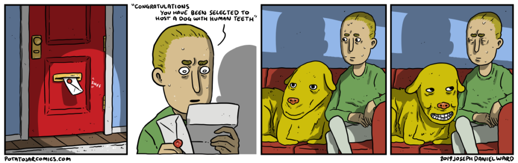 DOG WITH HUMAN TEETH by Joseph Daniel Ward on February 27, 2019 at 5:23 am Characters: human teeth No one told you to open the letter. Put this thing elsewhere: Click to share on X (Opens in new window) X Click to share on Facebook (Opens in new window) Facebook Click to share on Reddit (Opens in new window) Reddit Click to share on Tumblr (Opens in new window) Tumblr └ Tags: congratulations, dog, door, human teeth, letter Comment