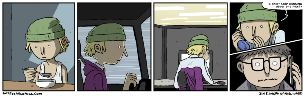 THINKIN’ ‘BOUT PAT by Joseph Daniel Ward on November 9, 2018 at 6:13 am Characters: Pat Turkey Are you allowed to wear a hat in here? Put this thing elsewhere: Click to share on X (Opens in new window) X Click to share on Facebook (Opens in new window) Facebook Click to share on Reddit (Opens in new window) Reddit Click to share on Tumblr (Opens in new window) Tumblr └ Tags: I think about Pat Turkey every day Comment