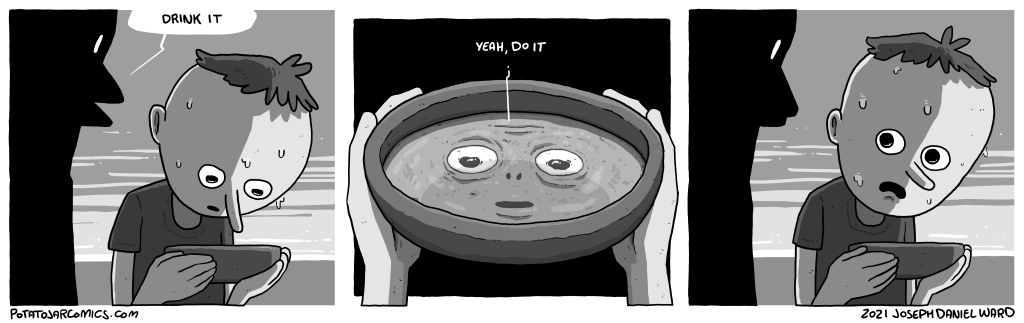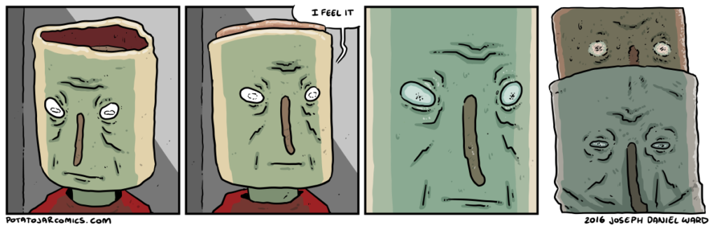 Someday I will categorize all of these comics, and this one will fit nicely into the not-insignificant category of “small guy emerges from regular guy.”