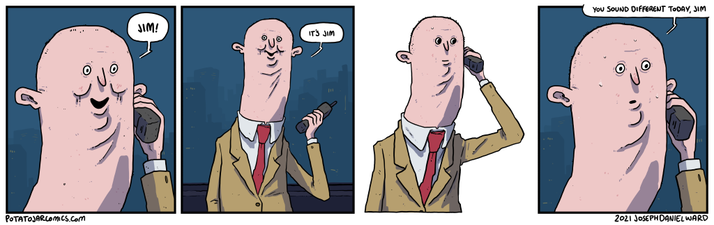 JIM! by Joseph Daniel Ward on January 13, 2021 at 4:13 pm I love talking to Jim! Put this thing elsewhere: Click to share on X (Opens in new window) X Click to share on Facebook (Opens in new window) Facebook Click to share on Reddit (Opens in new window) Reddit Click to share on Tumblr (Opens in new window) Tumblr └ Tags: Jim, phone Comment