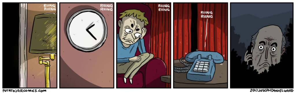 DON’T ANSWER IT by Joseph Daniel Ward on November 29, 2017 at 5:55 am I’ve had just about enough of your “telephone calls.” Put this thing elsewhere: Click to share on X (Opens in new window) X Click to share on Facebook (Opens in new window) Facebook Click to share on Reddit (Opens in new window) Reddit Click to share on Tumblr (Opens in new window) Tumblr └ Tags: chair, clock, curtain, door, lamp, phone, ring Comment