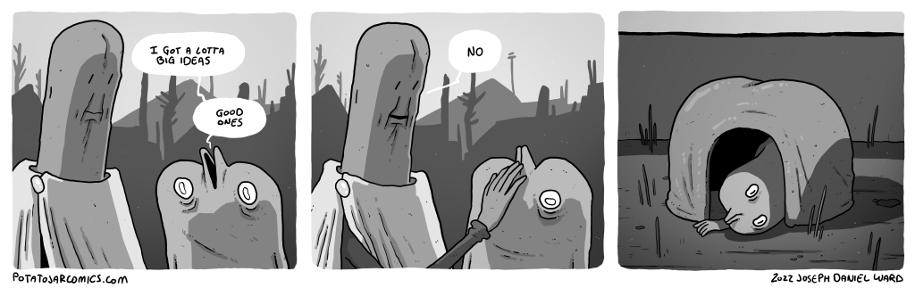 BIG IDEAS by Joseph Daniel Ward on September 30, 2022 at 2:03 pm I got a lotta big, good ideas too! Just kidding, they’re small and bad. Put this thing elsewhere: Click to share on X (Opens in new window) X Click to share on Facebook (Opens in new window) Facebook Click to share on Reddit (Opens in new window) Reddit Click to share on Tumblr (Opens in new window) Tumblr └ Tags: no Comment