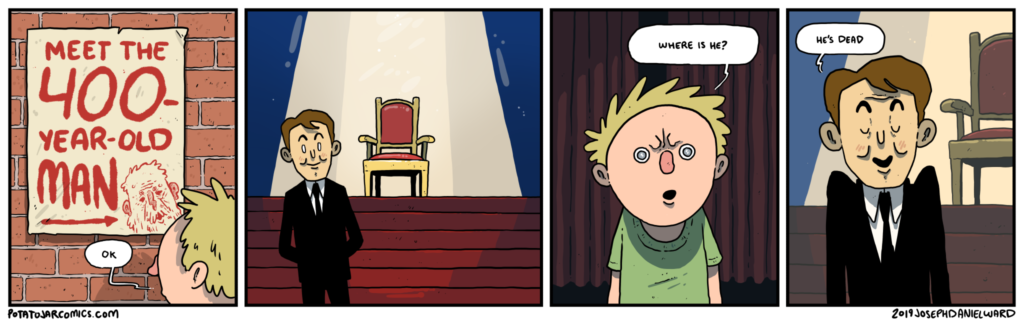 THE 400-YEAR-OLD MAN by Joseph Daniel Ward on July 5, 2019 at 4:25 am And hey, it’s the 400th Potatojar comic, what a coincidence. Put this thing elsewhere: Click to share on X (Opens in new window) X Click to share on Facebook (Opens in new window) Facebook Click to share on Reddit (Opens in new window) Reddit Click to share on Tumblr (Opens in new window) Tumblr └ Tags: 400, man, old, year Comment