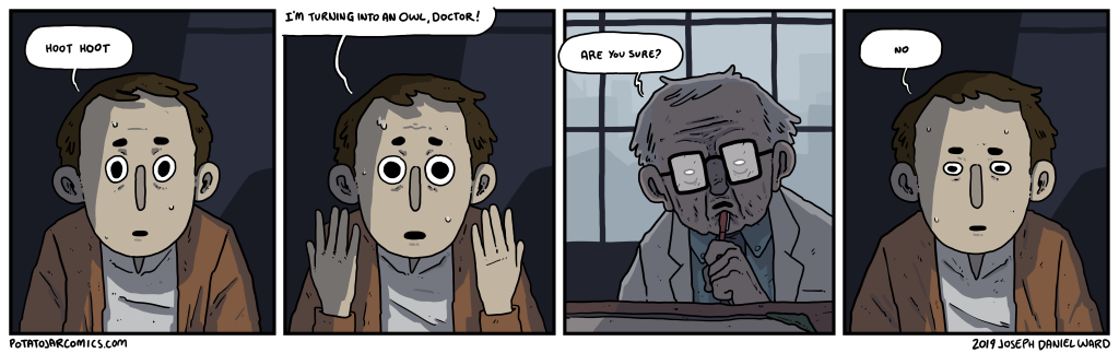 HOOT HOOT by Joseph Daniel Ward on November 20, 2019 at 4:10 pm He’s right, though, and it will be a grisly transformation — full-on, straight-up body horror. Put this thing elsewhere: Click to share on X (Opens in new window) X Click to share on Facebook (Opens in new window) Facebook Click to share on Reddit (Opens in new window) Reddit Click to share on Tumblr (Opens in new window) Tumblr └ Tags: doctor, help me, hoot, oh no, owl Comment