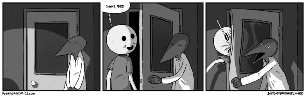 THANKS, BIRD III by Joseph Daniel Ward on August 28, 2019 at 5:34 am This man has very severe bird troubles. Put this thing elsewhere: Click to share on X (Opens in new window) X Click to share on Facebook (Opens in new window) Facebook Click to share on Reddit (Opens in new window) Reddit Click to share on Tumblr (Opens in new window) Tumblr └ Tags: bird, door, round, thanks Comment