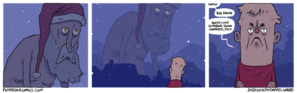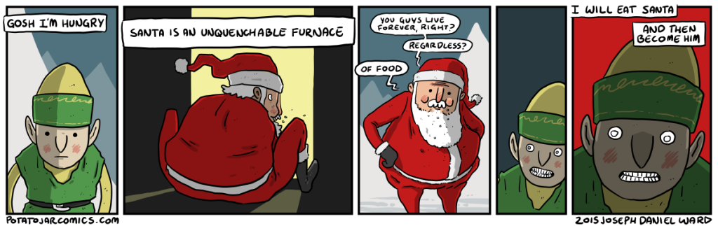 Jeffrey Santa still has a job to do, man. YES, it’s true: No comics until January 3rd due to holiday travel! Sorry, dudes, and also: Happy holidays! Please enjoy the continuing Jeffrey Saga.