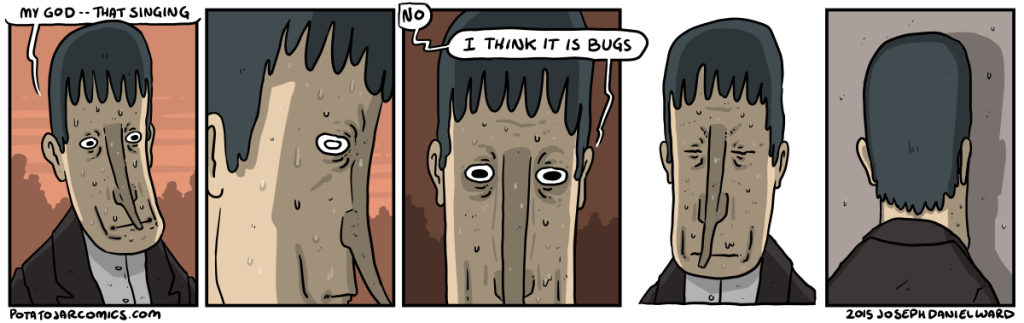 IT IS BUGS by Joseph Daniel Ward on December 3, 2015 at 7:54 am Characters: Sweaty Magician The Sweaty Magician has a moment. Put this thing elsewhere: Click to share on X (Opens in new window) X Click to share on Facebook (Opens in new window) Facebook Click to share on Reddit (Opens in new window) Reddit Click to share on Tumblr (Opens in new window) Tumblr └ Tags: it is bugs, singing Comment