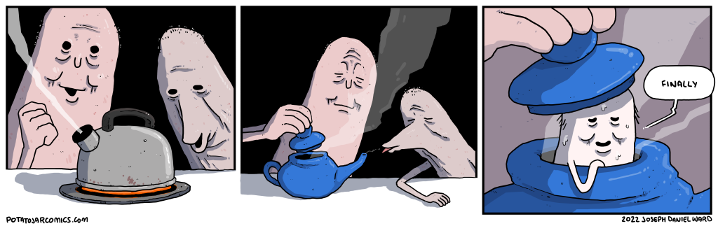 WE BREW OUR FRIENDS by Joseph Daniel Ward on March 16, 2022 at 2:56 pm Made a little guy, huh? Put this thing elsewhere: Click to share on X (Opens in new window) X Click to share on Facebook (Opens in new window) Facebook Click to share on Reddit (Opens in new window) Reddit Click to share on Tumblr (Opens in new window) Tumblr └ Tags: friend, pot, tea, water Comment