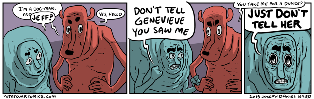 DOG-MAN JEFF by Joseph Daniel Ward on April 16, 2015 at 8:06 pm You can’t hide from Genevieve. Put this thing elsewhere: Click to share on X (Opens in new window) X Click to share on Facebook (Opens in new window) Facebook Click to share on Reddit (Opens in new window) Reddit Click to share on Tumblr (Opens in new window) Tumblr └ Tags: one guy is a dog-man and one guy is just weird, they're talking about things unfamiliar to you, this comic is a tough sell Comment