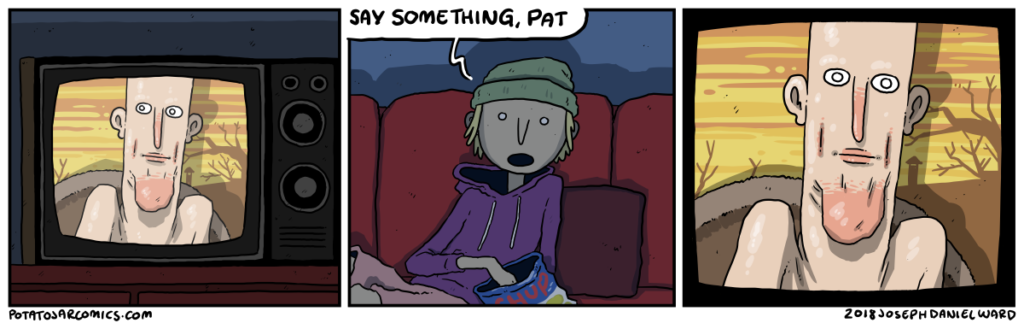 Can Pat see the cue cards? Anyway, no comic on 11/23 (the day after Thanksgiving) because… I don’t want to make a comic on Thanksgiving, I guess.