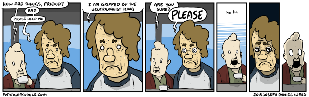 VENTRILOQUIST KING by Joseph Daniel Ward on May 12, 2015 at 3:22 am Aw man, not the Ventriloquist King again. Put this thing elsewhere: Click to share on X (Opens in new window) X Click to share on Facebook (Opens in new window) Facebook Click to share on Reddit (Opens in new window) Reddit Click to share on Tumblr (Opens in new window) Tumblr └ Tags: diner, oh noooooooooo, ventriloquist king Comment