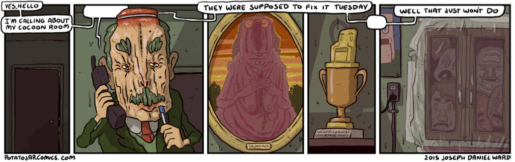 COCOON ROOM MAINTENANCE by Joseph Daniel Ward on July 2, 2015 at 3:18 am Ma’am, your business is compromising the integrity of my cocoon room and I won’t stand for it. Put this thing elsewhere: Click to share on X (Opens in new window) X Click to share on Facebook (Opens in new window) Facebook Click to share on Reddit (Opens in new window) Reddit Click to share on Tumblr (Opens in new window) Tumblr └ Tags: door, grundpep, head cabinet, sweaty walls, ventriloquist king Comment