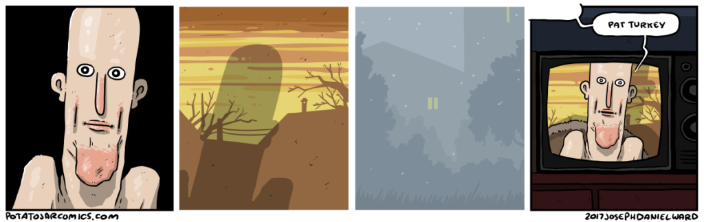 PAT TURKEY ORIGINS I by Joseph Daniel Ward on November 22, 2017 at 6:03 am Characters: Pat Turkey Oh, good for you. Put this thing elsewhere: Click to share on X (Opens in new window) X Click to share on Facebook (Opens in new window) Facebook Click to share on Reddit (Opens in new window) Reddit Click to share on Tumblr (Opens in new window) Tumblr └ Tags: birth, hmm, Pat, void Comment