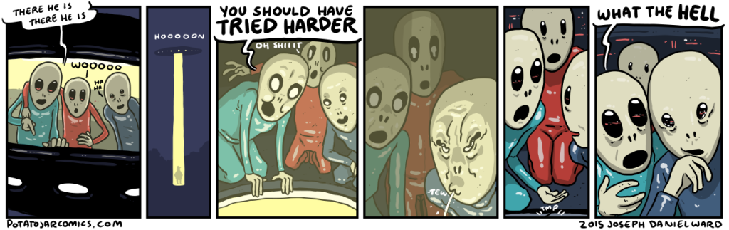 SPACE JERKS by Joseph Daniel Ward on August 27, 2015 at 2:33 am These aliens are not all on the same page. Put this thing elsewhere: Click to share on X (Opens in new window) X Click to share on Facebook (Opens in new window) Facebook Click to share on Reddit (Opens in new window) Reddit Click to share on Tumblr (Opens in new window) Tumblr └ Tags: aliens, spit, too far man, what the hell Comment
