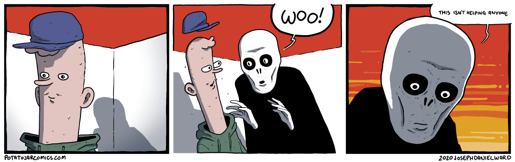 EXISTENTIAL CRISIS GHOUL by Joseph Daniel Ward on March 25, 2020 at 4:04 am I don’t know, maybe that guy needed to take his hat off. Put this thing elsewhere: Click to share on X (Opens in new window) X Click to share on Facebook (Opens in new window) Facebook Click to share on Reddit (Opens in new window) Reddit Click to share on Tumblr (Opens in new window) Tumblr └ Tags: Woo! Comment